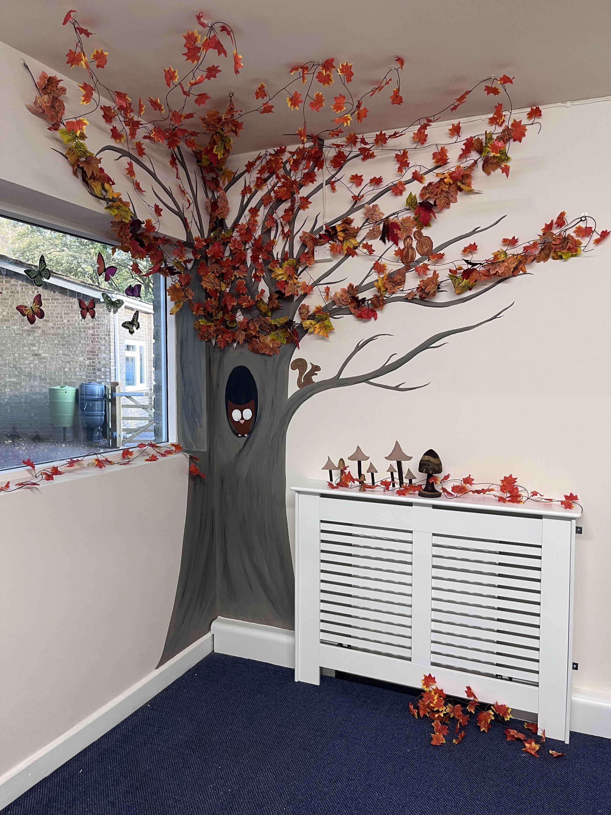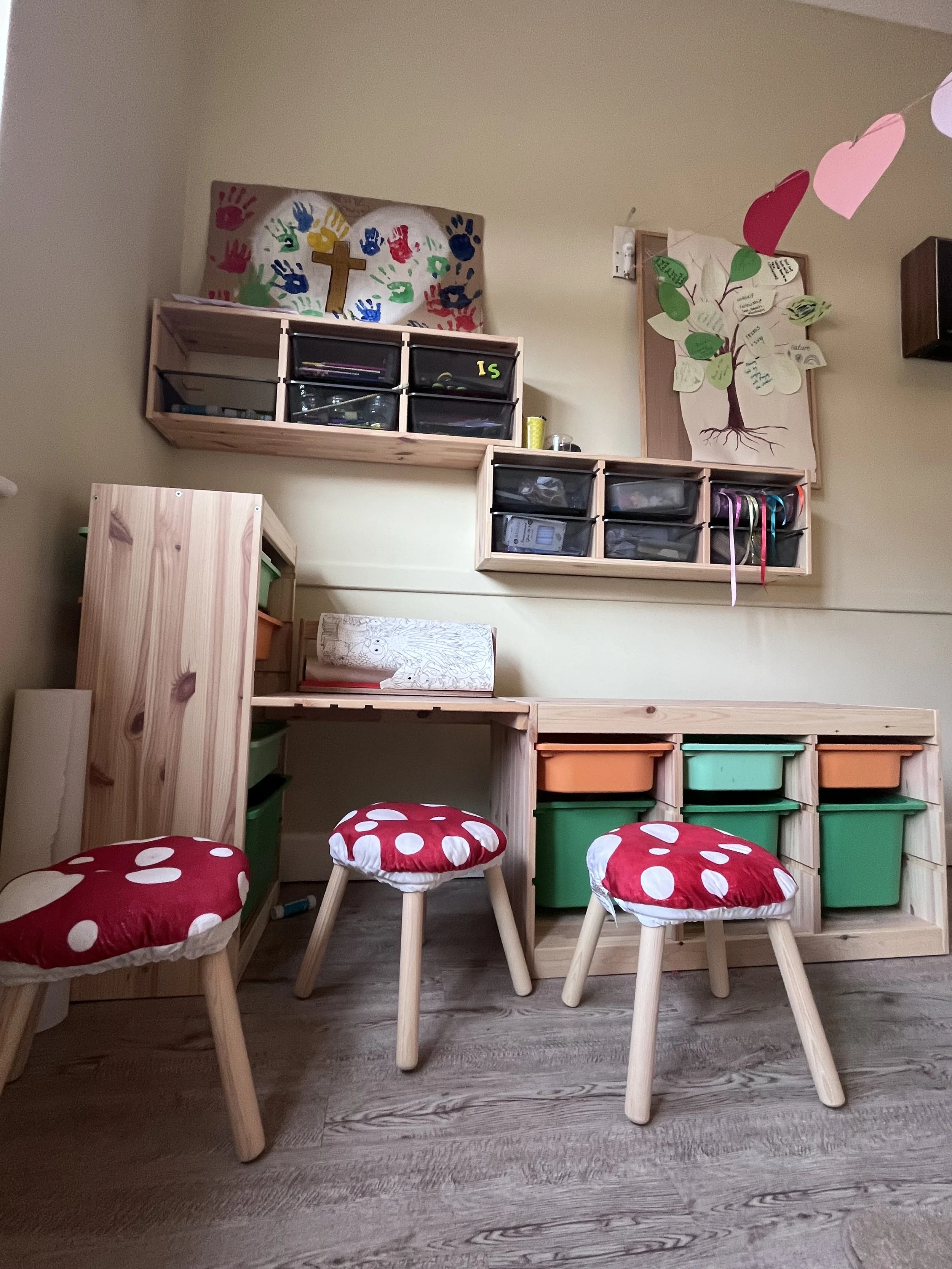The vision was clear: create a space that felt warm, inclusive, and calming somewhere both young and old could enjoy for crafts, quiet time, or relaxation. With a forest-inspired theme, rich earthy tones, and clever touches throughout, the result is a beautiful blend of nature and function.